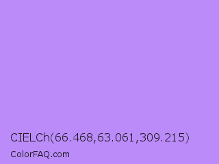 CIELCh 66.468,63.061,309.215 Color is a light violet color and the nearest color is Pale Violet #cc99ff. Hex code #bb8bfa and RGB value is rgb(187,139,250). In RGB color space, this color is composed of 73% red, 55% green, 98% blue, In CMYK color space, this color is composed of 25% cyan, 44% magenta, 0% yellow , 2% black , In HSL color space, this color has a hue angle of 266° , 92% saturation and 76% lightness.