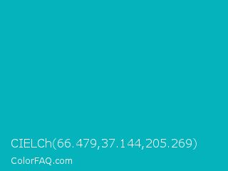 CIELCh 66.479,37.144,205.269 Color is a normal cyan color and the nearest color is Tiffany Blue #0abab5. Hex code #05b3bd and RGB value is rgb(5,179,189). In RGB color space, this color is composed of 2% red, 70% green, 74% blue, In CMYK color space, this color is composed of 97% cyan, 5% magenta, 0% yellow , 26% black , In HSL color space, this color has a hue angle of 183° , 95% saturation and 38% lightness.
