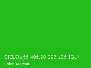 CIELCh 66.496,90.293,136.131 Color is a normal green color and the nearest color is Wageningen Green #34b233. Hex code #23bb19 and RGB value is rgb(35,187,25). In RGB color space, this color is composed of 14% red, 73% green, 10% blue, In CMYK color space, this color is composed of 81% cyan, 0% magenta, 87% yellow , 27% black , In HSL color space, this color has a hue angle of 116° , 76% saturation and 42% lightness.