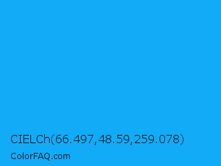 CIELCh 66.497,48.59,259.078 Color is a normal blue color and the nearest color is Vivid Cerulean #00aaee. Hex code #12abf7 and RGB value is rgb(18,171,247). In RGB color space, this color is composed of 7% red, 67% green, 97% blue, In CMYK color space, this color is composed of 93% cyan, 31% magenta, 0% yellow , 3% black , In HSL color space, this color has a hue angle of 200° , 93% saturation and 52% lightness.