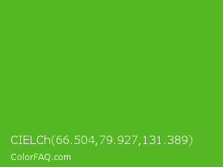 CIELCh 66.504,79.927,131.389 Color is a normal green color and the nearest color is Kelly Green #4cbb17. Hex code #56b725 and RGB value is rgb(86,183,37). In RGB color space, this color is composed of 34% red, 72% green, 15% blue, In CMYK color space, this color is composed of 53% cyan, 0% magenta, 80% yellow , 28% black , In HSL color space, this color has a hue angle of 100° , 66% saturation and 43% lightness.