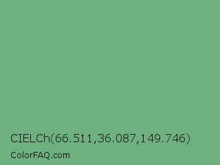CIELCh 66.511,36.087,149.746 Color is a normal green color and the nearest color is Iguana Green #71bc78. Hex code #6fb080 and RGB value is rgb(111,176,128). In RGB color space, this color is composed of 44% red, 69% green, 50% blue, In CMYK color space, this color is composed of 37% cyan, 0% magenta, 27% yellow , 31% black , In HSL color space, this color has a hue angle of 136° , 29% saturation and 56% lightness.