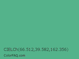 CIELCh 66.512,39.582,162.356 Color is a normal green color and the nearest color is Ocean Green #48bf91. Hex code #54b38b and RGB value is rgb(84,179,139). In RGB color space, this color is composed of 33% red, 70% green, 55% blue, In CMYK color space, this color is composed of 53% cyan, 0% magenta, 22% yellow , 30% black , In HSL color space, this color has a hue angle of 155° , 38% saturation and 52% lightness.