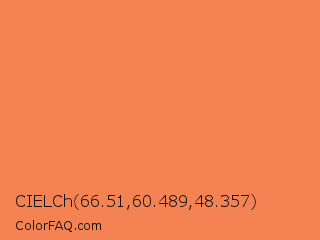 CIELCh 66.51,60.489,48.357 Color is a light orange color and the nearest color is Coral #ff7f50. Hex code #f58252 and RGB value is rgb(245,130,82). In RGB color space, this color is composed of 96% red, 51% green, 32% blue, In CMYK color space, this color is composed of 0% cyan, 47% magenta, 67% yellow , 4% black , In HSL color space, this color has a hue angle of 18° , 89% saturation and 64% lightness.