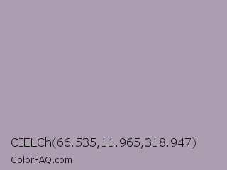 CIELCh 66.535,11.965,318.947 Color is a light purple color and the nearest color is Lilac Luster #ae98aa. Hex code #ac9db0 and RGB value is rgb(172,157,176). In RGB color space, this color is composed of 67% red, 62% green, 69% blue, In CMYK color space, this color is composed of 2% cyan, 11% magenta, 0% yellow , 31% black , In HSL color space, this color has a hue angle of 287° , 11% saturation and 65% lightness.