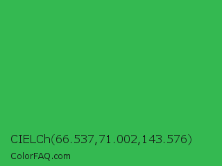 CIELCh 66.537,71.002,143.576 Color is a normal green color and the nearest color is Chateau Green #40a860. Hex code #34b951 and RGB value is rgb(52,185,81). In RGB color space, this color is composed of 20% red, 73% green, 32% blue, In CMYK color space, this color is composed of 72% cyan, 0% magenta, 56% yellow , 27% black , In HSL color space, this color has a hue angle of 133° , 56% saturation and 46% lightness.
