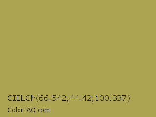 CIELCh 66.542,44.42,100.337 Color is a normal yellow color and the nearest color is Husk #b7a458. Hex code #ada451 and RGB value is rgb(173,164,81). In RGB color space, this color is composed of 68% red, 64% green, 32% blue, In CMYK color space, this color is composed of 0% cyan, 5% magenta, 53% yellow , 32% black , In HSL color space, this color has a hue angle of 54° , 36% saturation and 50% lightness.