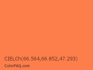 CIELCh 66.564,66.852,47.293 Color is a light orange color and the nearest color is Coral #ff7f50. Hex code #fd7d4b and RGB value is rgb(253,125,75). In RGB color space, this color is composed of 99% red, 49% green, 29% blue, In CMYK color space, this color is composed of 0% cyan, 51% magenta, 70% yellow , 1% black , In HSL color space, this color has a hue angle of 17° , 98% saturation and 64% lightness.