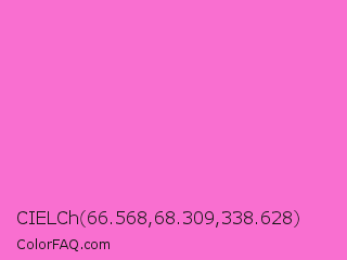 CIELCh 66.568,68.309,338.628 Color is a light magenta color and the nearest color is Rose Pink #ff66cc. Hex code #f96fd0 and RGB value is rgb(249,111,208). In RGB color space, this color is composed of 98% red, 44% green, 82% blue, In CMYK color space, this color is composed of 0% cyan, 55% magenta, 16% yellow , 2% black , In HSL color space, this color has a hue angle of 318° , 92% saturation and 71% lightness.
