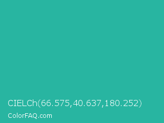 CIELCh 66.575,40.637,180.252 Color is a normal cyan color and the nearest color is Light Sea Green #20b2aa. Hex code #28b5a1 and RGB value is rgb(40,181,161). In RGB color space, this color is composed of 16% red, 71% green, 63% blue, In CMYK color space, this color is composed of 78% cyan, 0% magenta, 11% yellow , 29% black , In HSL color space, this color has a hue angle of 171° , 64% saturation and 43% lightness.