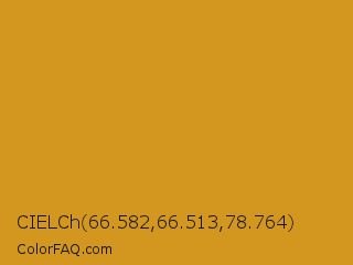 CIELCh 66.582,66.513,78.764 Color is a normal orange color and the nearest color is Geebung #d18f1b. Hex code #d3971f and RGB value is rgb(211,151,31). In RGB color space, this color is composed of 83% red, 59% green, 12% blue, In CMYK color space, this color is composed of 0% cyan, 28% magenta, 85% yellow , 17% black , In HSL color space, this color has a hue angle of 40° , 74% saturation and 47% lightness.