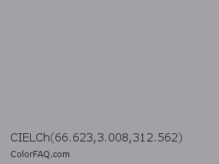 CIELCh 66.623,3.008,312.562 Color is a light purple color and the nearest color is Quick Silver #a6a6a6. Hex code #a4a1a6 and RGB value is rgb(164,161,166). In RGB color space, this color is composed of 64% red, 63% green, 65% blue, In CMYK color space, this color is composed of 1% cyan, 3% magenta, 0% yellow , 35% black , In HSL color space, this color has a hue angle of 276° , 3% saturation and 64% lightness.
