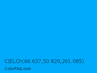 CIELCh 66.637,50.829,261.085 Color is a normal blue color and the nearest color is Vivid Cerulean #00aaee. Hex code #00abfc and RGB value is rgb(0,171,252). In RGB color space, this color is composed of 0% red, 67% green, 99% blue, In CMYK color space, this color is composed of 100% cyan, 32% magenta, 0% yellow , 1% black , In HSL color space, this color has a hue angle of 199° , 100% saturation and 49% lightness.