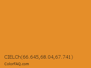 CIELCh 66.645,68.04,67.741 Color is a normal orange color and the nearest color is Cadmium Orange #ed872d. Hex code #e58e29 and RGB value is rgb(229,142,41). In RGB color space, this color is composed of 90% red, 56% green, 16% blue, In CMYK color space, this color is composed of 0% cyan, 38% magenta, 82% yellow , 10% black , In HSL color space, this color has a hue angle of 32° , 78% saturation and 53% lightness.