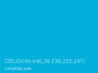 CIELCh 66.646,39.139,235.247 Color is a normal cyan color and the nearest color is Cerulean #02a4d3. Hex code #00b0db and RGB value is rgb(0,176,219). In RGB color space, this color is composed of 0% red, 69% green, 86% blue, In CMYK color space, this color is composed of 100% cyan, 20% magenta, 0% yellow , 14% black , In HSL color space, this color has a hue angle of 192° , 100% saturation and 43% lightness.