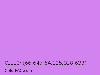 CIELCh 66.647,64.125,318.638 Color is a light purple color and the nearest color is Bright Lilac #d891ef. Hex code #d283ef and RGB value is rgb(210,131,239). In RGB color space, this color is composed of 82% red, 51% green, 94% blue, In CMYK color space, this color is composed of 12% cyan, 45% magenta, 0% yellow , 6% black , In HSL color space, this color has a hue angle of 284° , 77% saturation and 73% lightness.