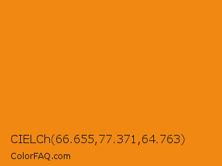 CIELCh 66.655,77.371,64.763 Color is a normal orange color and the nearest color is Golden Bell #e28913. Hex code #f08812 and RGB value is rgb(240,136,18). In RGB color space, this color is composed of 94% red, 53% green, 7% blue, In CMYK color space, this color is composed of 0% cyan, 43% magenta, 93% yellow , 6% black , In HSL color space, this color has a hue angle of 32° , 88% saturation and 51% lightness.