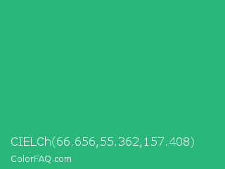 CIELCh 66.656,55.362,157.408 Color is a normal green color and the nearest color is Jungle Green #29ab87. Hex code #2ab87a and RGB value is rgb(42,184,122). In RGB color space, this color is composed of 16% red, 72% green, 48% blue, In CMYK color space, this color is composed of 77% cyan, 0% magenta, 34% yellow , 28% black , In HSL color space, this color has a hue angle of 154° , 63% saturation and 44% lightness.