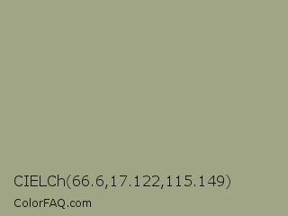 CIELCh 66.6,17.122,115.149 Color is a normal yellow color and the nearest color is Sage #9ea587. Hex code #a0a586 and RGB value is rgb(160,165,134). In RGB color space, this color is composed of 63% red, 65% green, 53% blue, In CMYK color space, this color is composed of 3% cyan, 0% magenta, 19% yellow , 35% black , In HSL color space, this color has a hue angle of 70° , 15% saturation and 59% lightness.