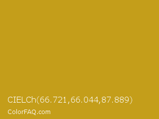 CIELCh 66.721,66.044,87.889 Color is a normal yellow color and the nearest color is Lemon Curry #cca01d. Hex code #c49e1a and RGB value is rgb(196,158,26). In RGB color space, this color is composed of 77% red, 62% green, 10% blue, In CMYK color space, this color is composed of 0% cyan, 19% magenta, 87% yellow , 23% black , In HSL color space, this color has a hue angle of 47° , 77% saturation and 44% lightness.