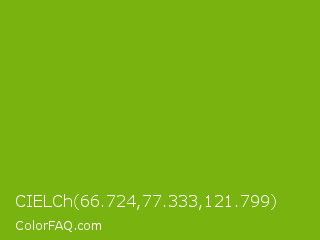 CIELCh 66.724,77.333,121.799 Color is a normal green color and the nearest color is Lima #76bd17. Hex code #78b30f and RGB value is rgb(120,179,15). In RGB color space, this color is composed of 47% red, 70% green, 6% blue, In CMYK color space, this color is composed of 33% cyan, 0% magenta, 92% yellow , 30% black , In HSL color space, this color has a hue angle of 82° , 85% saturation and 38% lightness.