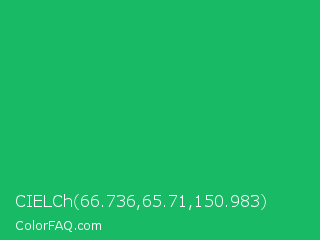 CIELCh 66.736,65.71,150.983 Color is a normal green color and the nearest color is Green Crayola #1cac78. Hex code #19ba66 and RGB value is rgb(25,186,102). In RGB color space, this color is composed of 10% red, 73% green, 40% blue, In CMYK color space, this color is composed of 87% cyan, 0% magenta, 45% yellow , 27% black , In HSL color space, this color has a hue angle of 149° , 76% saturation and 41% lightness.