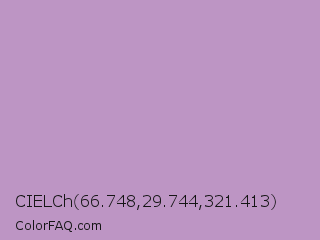 CIELCh 66.748,29.744,321.413 Color is a light purple color and the nearest color is Pastel Violet #cb99c9. Hex code #bd95c4 and RGB value is rgb(189,149,196). In RGB color space, this color is composed of 74% red, 58% green, 77% blue, In CMYK color space, this color is composed of 4% cyan, 24% magenta, 0% yellow , 23% black , In HSL color space, this color has a hue angle of 291° , 28% saturation and 68% lightness.