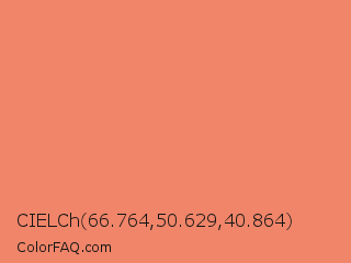 CIELCh 66.764,50.629,40.864 Color is a light red color and the nearest color is Salmon #fa8072. Hex code #f08569 and RGB value is rgb(240,133,105). In RGB color space, this color is composed of 94% red, 52% green, 41% blue, In CMYK color space, this color is composed of 0% cyan, 45% magenta, 56% yellow , 6% black , In HSL color space, this color has a hue angle of 12° , 82% saturation and 68% lightness.