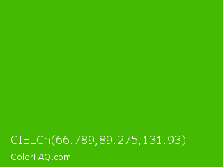 CIELCh 66.789,89.275,131.93 Color is a normal green color and the nearest color is Kelly Green #4cbb17. Hex code #44ba03 and RGB value is rgb(68,186,3). In RGB color space, this color is composed of 27% red, 73% green, 1% blue, In CMYK color space, this color is composed of 63% cyan, 0% magenta, 98% yellow , 27% black , In HSL color space, this color has a hue angle of 99° , 97% saturation and 37% lightness.