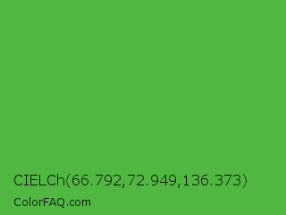 CIELCh 66.792,72.949,136.373 Color is a normal green color and the nearest color is Apple #4fa83d. Hex code #50b840 and RGB value is rgb(80,184,64). In RGB color space, this color is composed of 31% red, 72% green, 25% blue, In CMYK color space, this color is composed of 57% cyan, 0% magenta, 65% yellow , 28% black , In HSL color space, this color has a hue angle of 112° , 48% saturation and 49% lightness.