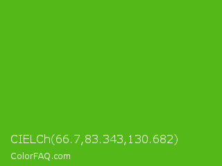 CIELCh 66.7,83.343,130.682 Color is a normal green color and the nearest color is Kelly Green #4cbb17. Hex code #54b819 and RGB value is rgb(84,184,25). In RGB color space, this color is composed of 33% red, 72% green, 10% blue, In CMYK color space, this color is composed of 54% cyan, 0% magenta, 86% yellow , 28% black , In HSL color space, this color has a hue angle of 98° , 76% saturation and 41% lightness.