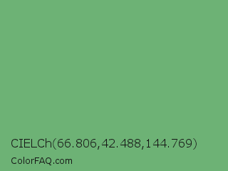 CIELCh 66.806,42.488,144.769 Color is a normal green color and the nearest color is Iguana Green #71bc78. Hex code #6db275 and RGB value is rgb(109,178,117). In RGB color space, this color is composed of 43% red, 70% green, 46% blue, In CMYK color space, this color is composed of 39% cyan, 0% magenta, 34% yellow , 30% black , In HSL color space, this color has a hue angle of 127° , 31% saturation and 56% lightness.