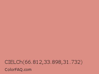 CIELCh 66.812,33.898,31.732 Color is a light red color and the nearest color is My Pink #d69188. Hex code #dd8e84 and RGB value is rgb(221,142,132). In RGB color space, this color is composed of 87% red, 56% green, 52% blue, In CMYK color space, this color is composed of 0% cyan, 36% magenta, 40% yellow , 13% black , In HSL color space, this color has a hue angle of 7° , 57% saturation and 69% lightness.