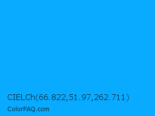 CIELCh 66.822,51.97,262.711 Color is a normal blue color and the nearest color is Blue Bolt #00b9fb. Hex code #08abff and RGB value is rgb(8,171,255). In RGB color space, this color is composed of 3% red, 67% green, 100% blue, In CMYK color space, this color is composed of 97% cyan, 33% magenta, 0% yellow , 0% black , In HSL color space, this color has a hue angle of 200° , 100% saturation and 52% lightness.