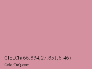 CIELCh 66.834,27.851,6.46 Color is a light red color and the nearest color is Can Can #d591a4. Hex code #d4909e and RGB value is rgb(212,144,158). In RGB color space, this color is composed of 83% red, 56% green, 62% blue, In CMYK color space, this color is composed of 0% cyan, 32% magenta, 25% yellow , 17% black , In HSL color space, this color has a hue angle of 348° , 44% saturation and 70% lightness.