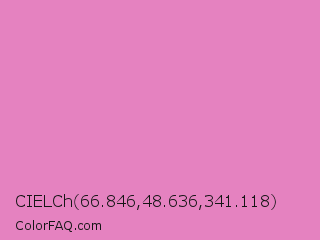 CIELCh 66.846,48.636,341.118 Color is a light magenta color and the nearest color is Shocking #e292c0. Hex code #e582c0 and RGB value is rgb(229,130,192). In RGB color space, this color is composed of 90% red, 51% green, 75% blue, In CMYK color space, this color is composed of 0% cyan, 43% magenta, 16% yellow , 10% black , In HSL color space, this color has a hue angle of 322° , 66% saturation and 70% lightness.