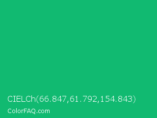 CIELCh 66.847,61.792,154.843 Color is a normal green color and the nearest color is Green Crayola #1cac78. Hex code #11ba71 and RGB value is rgb(17,186,113). In RGB color space, this color is composed of 7% red, 73% green, 44% blue, In CMYK color space, this color is composed of 91% cyan, 0% magenta, 39% yellow , 27% black , In HSL color space, this color has a hue angle of 154° , 83% saturation and 40% lightness.