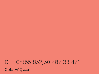 CIELCh 66.852,50.487,33.47 Color is a light red color and the nearest color is Salmon #fa8072. Hex code #f48273 and RGB value is rgb(244,130,115). In RGB color space, this color is composed of 96% red, 51% green, 45% blue, In CMYK color space, this color is composed of 0% cyan, 47% magenta, 53% yellow , 4% black , In HSL color space, this color has a hue angle of 7° , 85% saturation and 70% lightness.