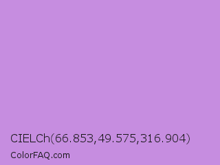 CIELCh 66.853,49.575,316.904 Color is a light purple color and the nearest color is Bright Lavender #bf94e4. Hex code #c68de0 and RGB value is rgb(198,141,224). In RGB color space, this color is composed of 78% red, 55% green, 88% blue, In CMYK color space, this color is composed of 12% cyan, 37% magenta, 0% yellow , 12% black , In HSL color space, this color has a hue angle of 281° , 57% saturation and 72% lightness.