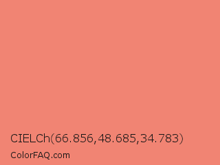 CIELCh 66.856,48.685,34.783 Color is a light red color and the nearest color is Tea Rose #f88379. Hex code #f18473 and RGB value is rgb(241,132,115). In RGB color space, this color is composed of 95% red, 52% green, 45% blue, In CMYK color space, this color is composed of 0% cyan, 45% magenta, 52% yellow , 5% black , In HSL color space, this color has a hue angle of 8° , 82% saturation and 70% lightness.