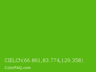 CIELCh 66.861,83.774,129.358 Color is a normal green color and the nearest color is Kelly Green #4cbb17. Hex code #59b812 and RGB value is rgb(89,184,18). In RGB color space, this color is composed of 35% red, 72% green, 7% blue, In CMYK color space, this color is composed of 52% cyan, 0% magenta, 90% yellow , 28% black , In HSL color space, this color has a hue angle of 94° , 82% saturation and 40% lightness.