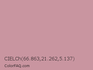CIELCh 66.863,21.262,5.137 Color is a light red color and the nearest color is Viola #cb8fa9. Hex code #c995a0 and RGB value is rgb(201,149,160). In RGB color space, this color is composed of 79% red, 58% green, 63% blue, In CMYK color space, this color is composed of 0% cyan, 26% magenta, 20% yellow , 21% black , In HSL color space, this color has a hue angle of 347° , 33% saturation and 69% lightness.