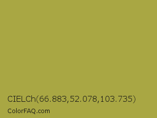 CIELCh 66.883,52.078,103.735 Color is a normal yellow color and the nearest color is Brass #b5a642. Hex code #a9a743 and RGB value is rgb(169,167,67). In RGB color space, this color is composed of 66% red, 65% green, 26% blue, In CMYK color space, this color is composed of 0% cyan, 1% magenta, 60% yellow , 34% black , In HSL color space, this color has a hue angle of 59° , 43% saturation and 46% lightness.