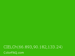 CIELCh 66.893,90.182,133.24 Color is a normal green color and the nearest color is Kelly Green #4cbb17. Hex code #3bbb09 and RGB value is rgb(59,187,9). In RGB color space, this color is composed of 23% red, 73% green, 4% blue, In CMYK color space, this color is composed of 68% cyan, 0% magenta, 95% yellow , 27% black , In HSL color space, this color has a hue angle of 103° , 91% saturation and 38% lightness.