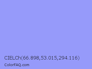 CIELCh 66.898,53.015,294.116 Color is a light blue color and the nearest color is Portage #8b9fee. Hex code #969afa and RGB value is rgb(150,154,250). In RGB color space, this color is composed of 59% red, 60% green, 98% blue, In CMYK color space, this color is composed of 40% cyan, 38% magenta, 0% yellow , 2% black , In HSL color space, this color has a hue angle of 238° , 91% saturation and 78% lightness.