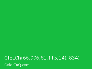 CIELCh 66.906,81.115,141.834 Color is a normal green color and the nearest color is Dark Pastel Green #03c03c. Hex code #16bc40 and RGB value is rgb(22,188,64). In RGB color space, this color is composed of 9% red, 74% green, 25% blue, In CMYK color space, this color is composed of 88% cyan, 0% magenta, 66% yellow , 26% black , In HSL color space, this color has a hue angle of 135° , 79% saturation and 41% lightness.