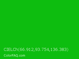 CIELCh 66.912,93.754,136.383 Color is a normal green color and the nearest color is Vivid Malachite #00cc33. Hex code #0dbd0f and RGB value is rgb(13,189,15). In RGB color space, this color is composed of 5% red, 74% green, 6% blue, In CMYK color space, this color is composed of 93% cyan, 0% magenta, 92% yellow , 26% black , In HSL color space, this color has a hue angle of 121° , 87% saturation and 40% lightness.