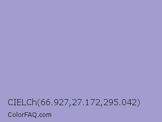 CIELCh 66.927,27.172,295.042 Color is a light indigo color and the nearest color is Blue Bell #a2a2d0. Hex code #a19ecf and RGB value is rgb(161,158,207). In RGB color space, this color is composed of 63% red, 62% green, 81% blue, In CMYK color space, this color is composed of 22% cyan, 24% magenta, 0% yellow , 19% black , In HSL color space, this color has a hue angle of 244° , 34% saturation and 72% lightness.
