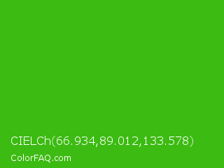 CIELCh 66.934,89.012,133.578 Color is a normal green color and the nearest color is Kelly Green #4cbb17. Hex code #3cbb12 and RGB value is rgb(60,187,18). In RGB color space, this color is composed of 24% red, 73% green, 7% blue, In CMYK color space, this color is composed of 68% cyan, 0% magenta, 90% yellow , 27% black , In HSL color space, this color has a hue angle of 105° , 82% saturation and 40% lightness.