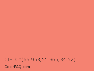 CIELCh 66.953,51.365,34.52 Color is a light red color and the nearest color is Salmon #fa8072. Hex code #f58271 and RGB value is rgb(245,130,113). In RGB color space, this color is composed of 96% red, 51% green, 44% blue, In CMYK color space, this color is composed of 0% cyan, 47% magenta, 54% yellow , 4% black , In HSL color space, this color has a hue angle of 8° , 87% saturation and 70% lightness.